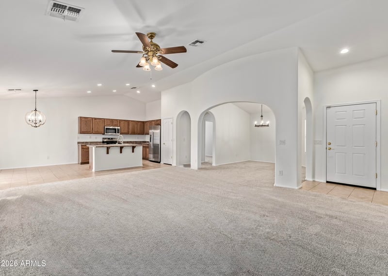 Listing details for 3627 Camden Ave, San Tan Valley, AZ 85140 : Step into this beautifully refreshed 4 bedroom, 2 bath home featuring a desirable split floor plan and open concept design! Enjoy brand new carpet and fresh paint throughout, complemented by sleek stainless steel appliances. The spacious kitchen flows effortlessly into the living area perfect for entertaining.