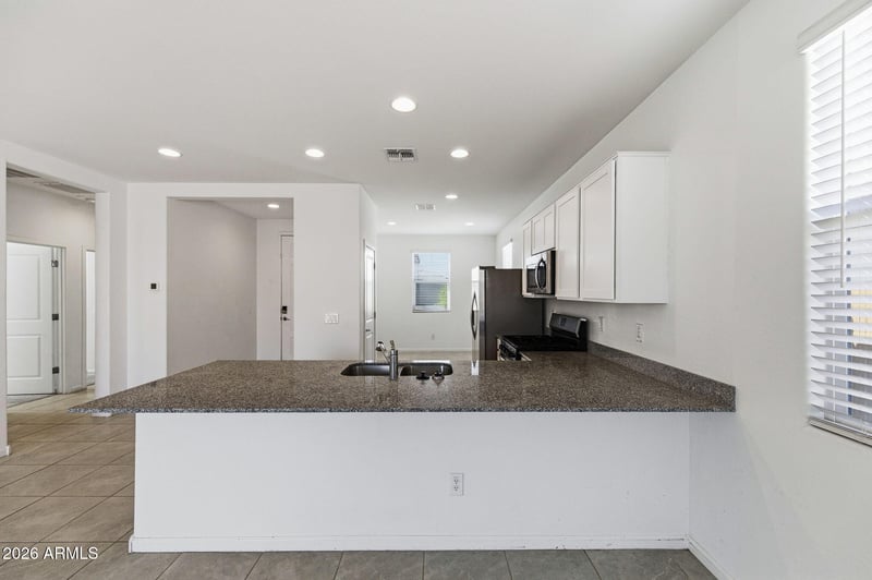 Listing details for 36400 Mediterranean Way, Maricopa, AZ 85138 : This great three-bedroom, two-bathroom home built in 2023 offers a perfect move-in-ready experience in a modern, open-concept package. The interior shines with neutral tile flooring throughout the main living areas, complemented kitchen featuring granite countertops, crisp white cabinetry, and a full suite of stainless steel appliances iincluding the refrigerator. Every corner of this residence reflects the quality of its recent construction, from the bright recessed lighting to the polished, contemporary finishes. The effortless desert lifestyle continues outside to a rocked backyard complete with a covered patio. With its meticulous upkeep and modern energy efficiency, this home provides all the benefits of a new build without the wait. The oversized laundry room includes the washer & dryer! The Andderson Farms community features walking paths and tot lots.
