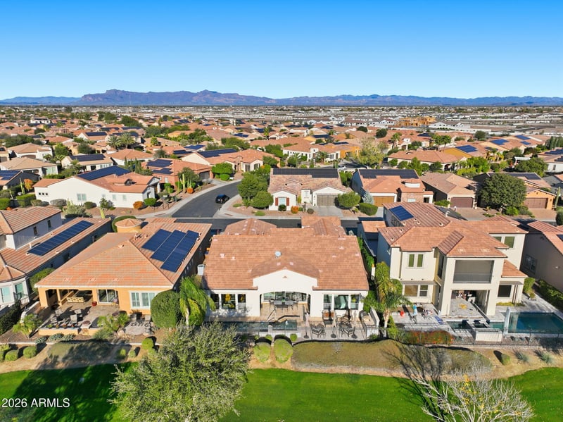 Listing details for 36442 Crucillo Dr, Queen Creek, AZ 85140 : Rare Alora floor plan in Encanterra Country Club with breathtaking golf course, dual fairway, and mountain views! This stunning home shows like a model and features 3 bedrooms, 3.5 baths, including a private casita and separate sitting room, plus a dedicated office. Enjoy Arizona living at its finest with a private pool, expansive kitchen with large island, gourmet appliances, and a gorgeous morning room with fireplace. Thoughtful upgrades include surround sound and remote-controlled shades throughout. Seller is a current golf member—ask agent about the opportunity to join Encanterra's prestigious private golf club without the waitlist! Experience resort-style living with multiple pools, spa, fitness center, championship golf, and award-winning dining. Live The Good Life at Encanterra.