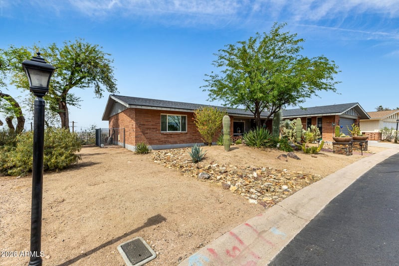 Listing details for 3650 Quenton Dr #5, Mesa, AZ 85215 : Charming brick home on a gated cul-de-sac! Manicured desert landscape, covered front patio, & 2-car garage. Inviting open layout with recessed lighting, thick baseboards, wood-look floors, & custom paint. The cozy living area features a stone-accented wood-burning fireplace & multi-sliding doors to the outside. Well-appointed kitchen has breakfast bar, staggered cabinetry w/crown moulding, SS appliances, & mosaic backsplash. Spacious main bedroom offers two walk-in closets, makeup vanity, & bathroom w/dual sinks, glass-enclosed shower, & backyard access. The 3rd bedroom includes a Murphy bed, a versatile space for an office or guest quarters! Enjoy the backyard boasting a covered deck, built-in BBQ, cement benches, lovely pavers, & city lights/mountain views. Arizona living at its finest!