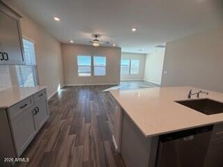 Listing details for 36795 Santa Maria St, Maricopa, AZ 85138 : You'll love the spacious layout featuring 4 bedrooms and 2 bathrooms, where the kitchen effortlessly flows into the family and dining rooms - perfect for entertaining or cozy nights in. Imagine cooking in your dream kitchen, complete with Neutral gray cabinetry, and stunning quartz countertops with a matching in both the kitchen and baths. Luxury wood like tile flooring throughout adds a modern elegance touch along w/two-tone interior paint creates a fresh atmosphere. The split bedroom layout offers extra privacy.