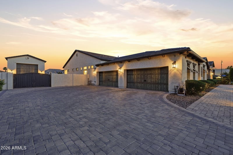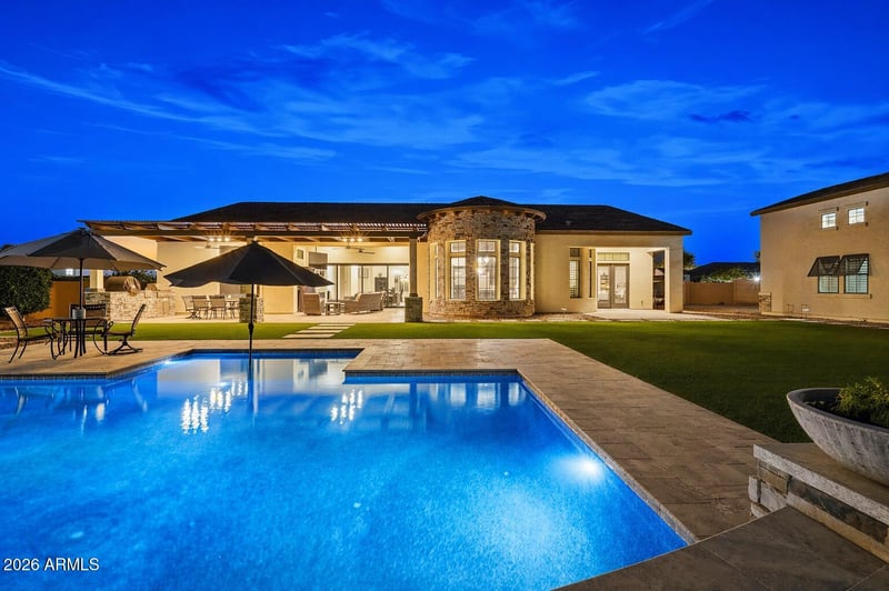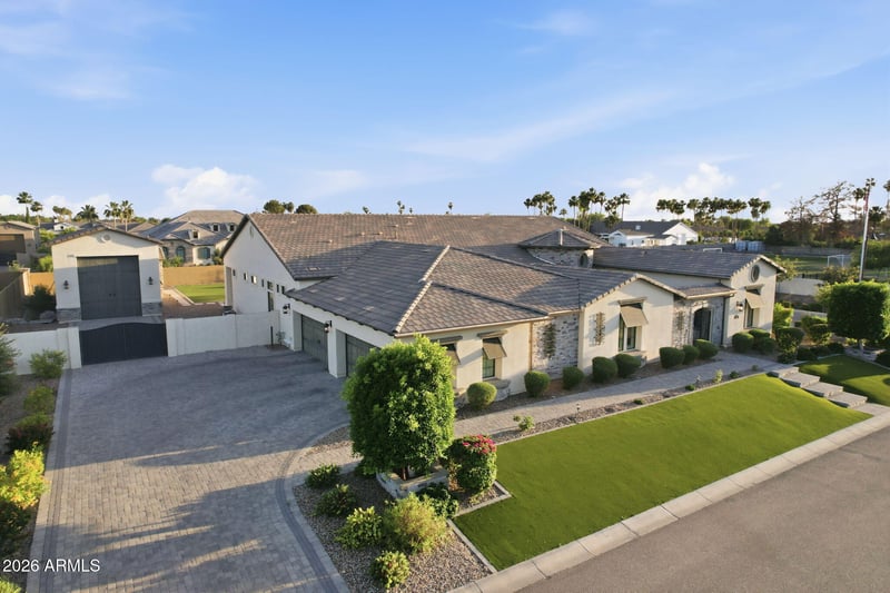 Listing details for 3717 Julep St, Mesa, AZ 85205 : **2.25 ASSUMABLE VA LOAN** Located in the gated Estates at Mandarin Grove--an intimate community of just 11 custom homes--this beautifully designed residence sits on a spacious corner lot and offers the perfect balance of comfort, style, and functionality. The home features 5 ensuite bedrooms, including an attached casita with its own private entrance, ideal for guests or multi-generational living. A gated front courtyard creates a welcoming sense of privacy. Inside, wood-look tile flooring and thoughtful upgrades add warmth and character throughout. The kitchen is equipped with high-end Wolf and Sub-Zero appliances, a large walk-in pantry, and opens seamlessly to the main living space. A custom fireplace, upgraded sliding glass doors, and electronic shades in the living area create an effortless indoor-outdoor feel. The southern exposure backyard is built for entertaining, with a pebble-finish pool, Baja shelf, tiered water feature, lighting, travertine, expansive turf, built-in BBQ, and a covered patio. Car enthusiasts and hobbyist will love the 20x50 RV garage with 16-foot ceilings, epoxy floors, air conditioning, half bath, industrial fan, and dual sinks, along with a 4-car garage with its own mini-split system. Radiant barriers in both the home and RV garage help improve energy efficiency and temperature control. The primary suite offers a spacious walk-in closet and a spa-style shower. A standout opportunity in one of Mesa's most desirable gated communities.