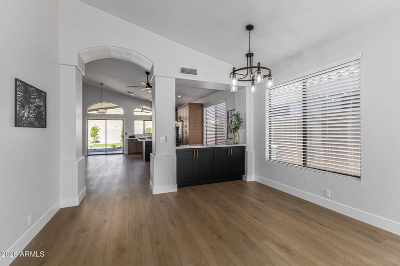 Listing details for 3718 Isabella Ave, Mesa, AZ 85206 : Completely REMODELED and Move-in Ready in desirable Brigata community! This 4-bedrooms, 2-bathrooms home features vaulted ceilings and beautiful updates throughout including fresh interior & exterior paint, luxury vinyl plank flooring, new carpet, updated bathrooms, and new fans, fixtures and blinds. The STUNNING kitchen showcases BRAND NEW two-tone cabinetry featuring light oak cabinets and a dramatic black center island with breakfast bar seating, quartz countertops and stainless steel appliances. Low-maintenance backyard offers covered patio and artificial turf. BRAND NEW ROOF WITH TRANSFERABLE WARRANTY! Enjoy convenient freeway access, walking distance to shopping & dining at Dana Park, and low HOA fees!