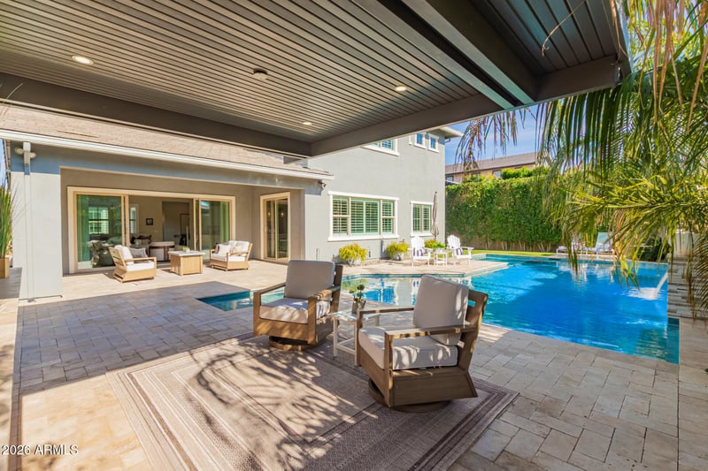 Listing details for 3743 Arabian Dr, Gilbert, AZ 85296 : Located in the highly sought-after community of Morrison Ranch, known for its peaceful, tree-lined streets and serene, storybook charm, this highly upgraded Maracay home built in 2019 offers 6 bed, 5 bath, and 4,801 sq. ft. of living space, including an office, large loft, and an oversized 36-foot-deep 4.5-car garage with 10-foot ceilings. Exceptionally well cared for and absolutely meticulous, the home sits on a premium north/south-facing lot and features a modern open floor plan that balances quiet privacy with open, shared living spaces. Designer details abound, including wood-look plank tile floors, updated lighting and fans, raised vanities, coffered ceilings, and more. The main level includes a glass-walled office and a flexible space ideal for formal dining or a game room, opening to an extended travertine side courtyard with natural gas hookup for barbecuing or a fire pit, enhancing outdoor living. At the heart of the home is a light-filled great room and gourmet kitchen with a gas fireplace, marble countertops, Wolf gas range and ovens, Sub-Zero refrigerator, Bosch dishwasher, extended island with full seating, walk-in pantry, soft-close cabinetry, pull-out drawers, and additional counter and storage space perfect for entertaining. Enjoy seamless indoor-outdoor living through 16-foot center-pull sliding glass doors leading to a private backyard retreat featuring additional natural gas hookup for barbecuing or fire pits, along with a convenient outdoor shower. A downstairs second primary suite with its own mini-split system is ideal for guests or multi-generational living, while upstairs features an oversized primary suite with extended shower, dual sink areas, expansive walk-in closet, loft, laundry room, and large secondary bedrooms. The resort-style backyard invites year-round enjoyment with a travertine patio, shaded pergola, glass-tiled Baja shelf, and heated poolperfect for entertaining and making lasting memories. Mortgage savings may be available for buyers of this listing.