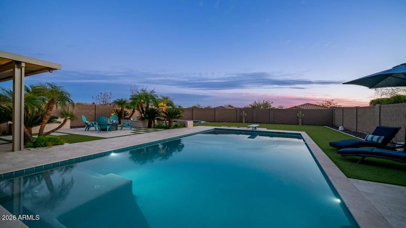 Listing details for 3743 Lapenna Dr, New River, AZ 85087 : Experience elevated desert living in this exceptional 6 bedroom, 4 bathroom Arroyo Norte home offering energy efficiency, flexible space, breathtaking mountain views, walking distance to Great Hearts Anthem, the #3 ranked charter school in Arizona, and situated on just over a ¼ acre lot! Built with 2x6 construction, spray foam insulation, added insulation between living levels, and a fully insulated garage at time of construction, this residence delivers year round comfort and performance. Inside, Luxury Vinyl Plank flooring, upgraded 5 1/4 inch baseboards, can lighting, and a custom built-in pocket office with walnut top create a refined yet functional interior. The kitchen impresses with full overlay white shaker cabinets, brushed nickel pulls, 42 inch upper cabinets, pull-outs in lower cabinets, quartz counters, stainless appliances including a Bosch dishwasher, Blanco granite composite undermount sink, pendant lighting, and a spacious walk-in pantry. A downstairs bedroom and full bath provide ideal flexibility for guests or multigenerational living. Upstairs features a generous loft, convenient laundry room, two secondary bedrooms with walk-in closets connected by a Jack and Jill bath with raised vanity, double sinks, and separate toilet and shower room, plus two additional bedrooms sharing a hall bath with raised vanity and double sinks. The primary suite offers split vanities, separate tub and shower, and a large walk-in closet. Hunter Douglas top down bottom up honeycomb blinds with blackout features and poly-vinyl dual pane windows enhance privacy and efficiency throughout. The 4 car tandem garage stands out with brand new epoxy flooring in the front half and a climate controlled rear section complete with carpet, mini-split system, and optional room dividing curtain, ideal for a workshop or fitness space. The backyard is designed for entertaining with an 18 ft x 36 ft diving pool with diving board and pebble sheen finish, artificial turf, built-in trampoline, travertine pavers, raised planter beds, two storage sheds on paver pads, a massive extended covered patio, and multiple dining and lounging areas, all framed by views of Daisy Mountain from the backyard and Gavilan Peak from the front of the home.