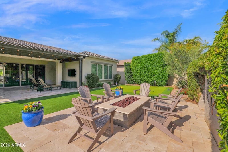 The backyard is gorgeous and designed for true Arizona indoor-outdoor living, featuring an extended travertine patio, covered patio and pergola, a fire feature for gathering, plenty of artificial turf, putting green, and multiple seating and lounge areas. Whether you're under the pergola, near the fire feature, or working on your short game, this backyard is a year-round delight.