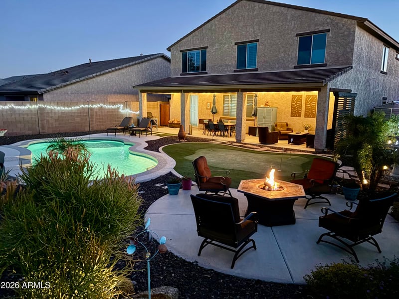 Listing details for 3748 Bingham Dr, New River, AZ 85087 : Step into a world of elegance with this remarkable two-story home, where custom accents await at every turn. The exterior boasts an enchanting yard, complete with a sparkling blue pool, an expansive covered patio extension, a putting green, and an oasis of privacy that invites relaxation and entertainment. 2x6 construction with newer-efficient performance spray foam insulation over all of the living spaces in the attic.