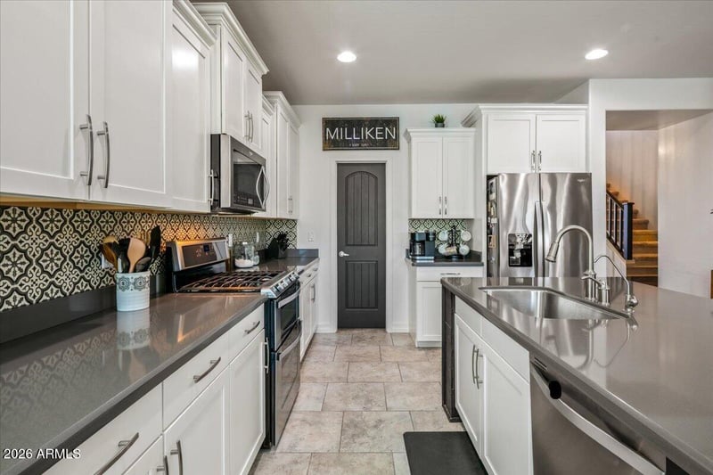 As you enter, soaring ceilings and an extraordinary custom space adorned with a charming brick wall, arched windows, elegant wood built-ins, and striking ceiling beams, all illuminated by unique light fixtures. Whether you choose to preserve this magical space or transform it into a sophisticated den for remote work, its potential is limitless. The heart of the home is a modern kitchen that dazzles with its ample stagger white cabinets, stainless steel appliances, a gas stove, and oven, all beautifully complemented by quartz countertops. A large island and a custom tile backsplash add to the allure, while a spacious walk-in pantry provides ample storage. This culinary haven flows seamlessly into a sunlit breakfast nook and a cozy family room, ideal for gatherings.