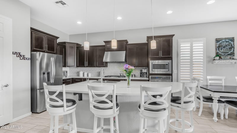 Listing details for 3756 Wisteria Dr, Chandler, AZ 85286 : Highly Upgraded Home. Great Room Floorplan with 15' slider for indoor and outdoor living with electric shades and valances. Kitchen Features Quartz Island with stainless appliances, gas cooktop, chefs hood, pendant lighting, Walkin pantry and tiled backsplash. Split Master bedroom with Walkin shower, dual vanities and Walkin closet. Beautiful backyard with Hot Tub, firepit, garden, turf area, Gazebo, BBQ Grill with sink, side burner and travertine tile surrounds. Custom lighting and paint throughout with plank tile flooring, wood shutters, epoxy garage flooring, cabinetry and surround sound system. LVP flooring in 2 front bedrooms and primary. Large Den or Sitting room. 8' doors throughout home. 2022 Water heater and 2025 HVAC compressor, Garage door opener with WIFI. front security door with paver walkway and artificial grass. This home shows excellent with lake and playground right around the corner.