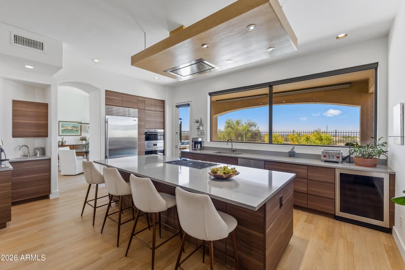 Stepping inside, picturesque views of Camelback Mountain take center stage from the living room. A marble-tiled entry and wood-look luxury vinyl plank flooring set a clean, modern tone, allowing designer lighting and soaring ceilings to shine.