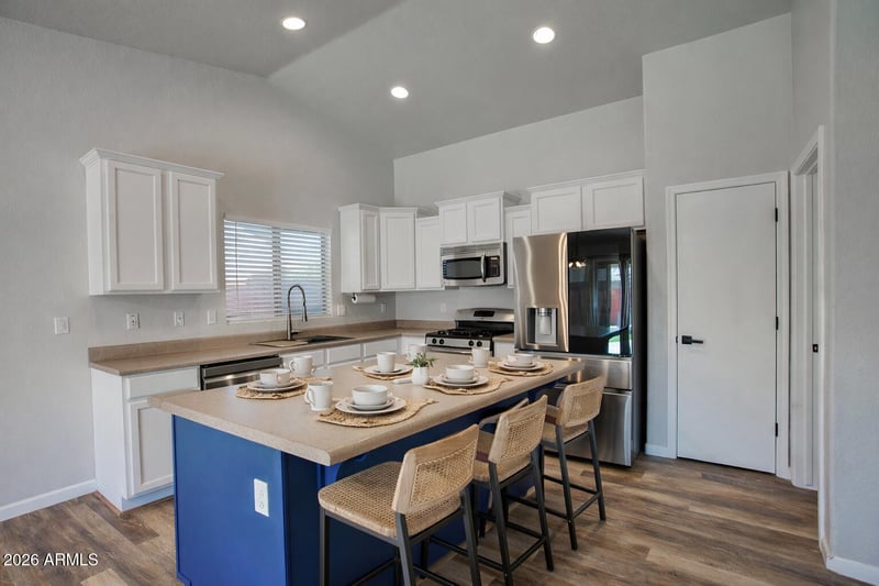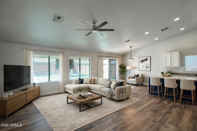 Listing details for 3771 Elmington Cir, San Tan Valley, AZ 85140 : Tucked away in a quiet cul-de-sac, this beautifully refreshed single-level home delivers the perfect blend of comfort, functionality, and easy Arizona living. Featuring 3 spacious bedrooms and 2 bathrooms, the interior has been thoughtfully updated with modern flooring, fresh paint, and a newer AC system, giving the home a clean, move-in-ready feel from the moment you walk in. Vaulted ceilings elevate the main living space, creating an open and inviting great room that flows seamlessly into the kitchen, complete with a large island and sleek stainless steel appliances, ideal for both everyday living and entertaining.