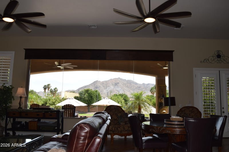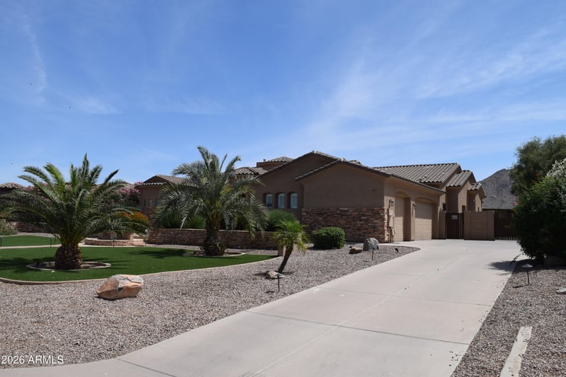 Listing details for 3771 Sunnydale Dr, Queen Creek, AZ 85142 : Elevate your lifestyle in this breathtaking custom estate, where architectural brilliance meets the serene beauty of the San Tan Mountains. Situated on an expansive lot with no HOA, this residence offers a level of privacy and freedom that is truly rare. Your arrival is heralded by a stately wrought iron front gate and a grand custom door that opens into a spectacular split-floorplan designed for both grand-scale entertaining and intimate daily living. The heart of the home is a sun-drenched great room characterized by soaring high ceilings and a dramatic wall of glass that perfectly frames unobstructed mountain views. This space is an indulgence in modern luxury, featuring custom motorized shades, designer ceiling fans, and a striking stone-tiled entertainment wall anchored by a cozy fireplace. A fully equipped wet bar with a built-in beverage fridge ensures your guests always have a glass in hand.