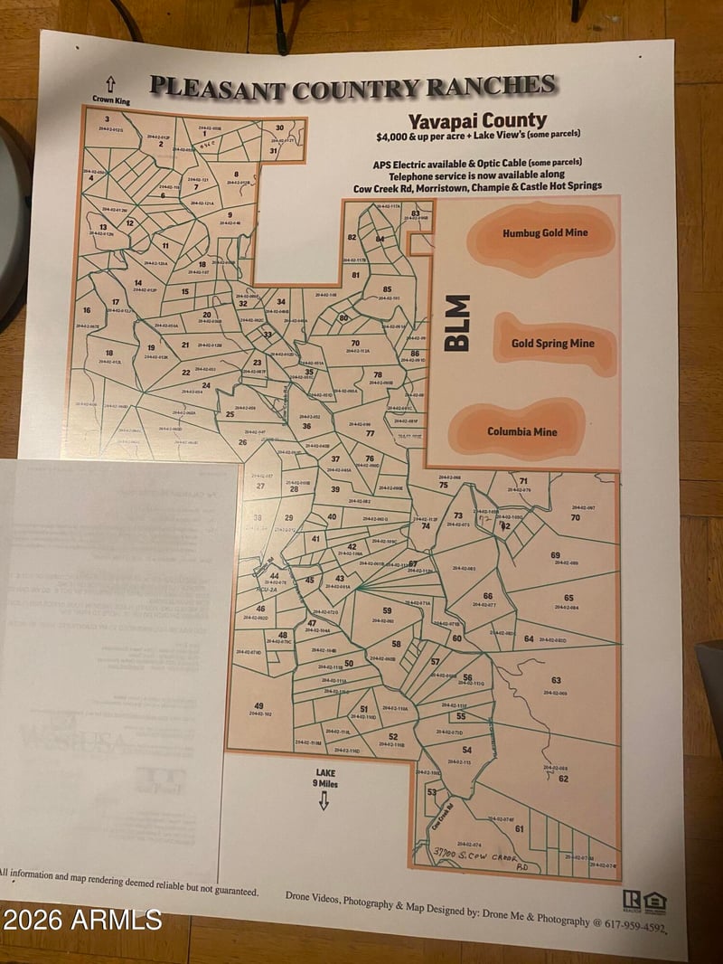 Listing details for 37750 Cow Creek Rd #53, Morristown, AZ 85342 : easy access 2 or more acres available easy access gentle slope away from road beautiful views of mountains with a mountain on behind the parcel for shade in the west. owner may carry with a good down payment. Owner lives temporarily in a triler at the top of the 8 ac parcel. cow creek and concrete dam is across the road with water all year round for animals.View of the Bradshaw Mountains to the north. Lot 53 is approx 10 miles from the end of Lake pleasant. 8 new homes are going in Great time to buy before prices soar. Pleasant country ranches is 4,000 acre subdivision no HOA,NO MOBILE HOMES NO SIZE LIMIT ONE RES PER TWO AC SEVERAL PARCELS TO CHOOSE FROM