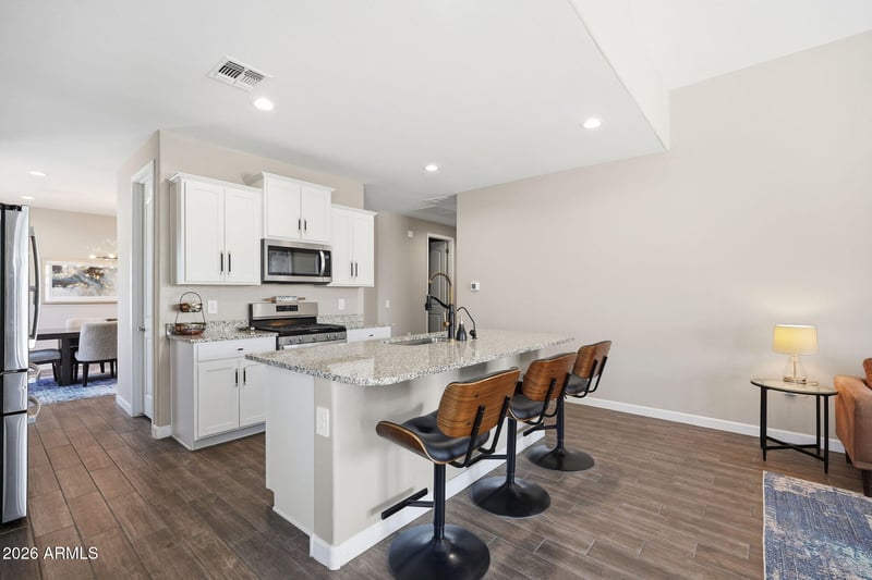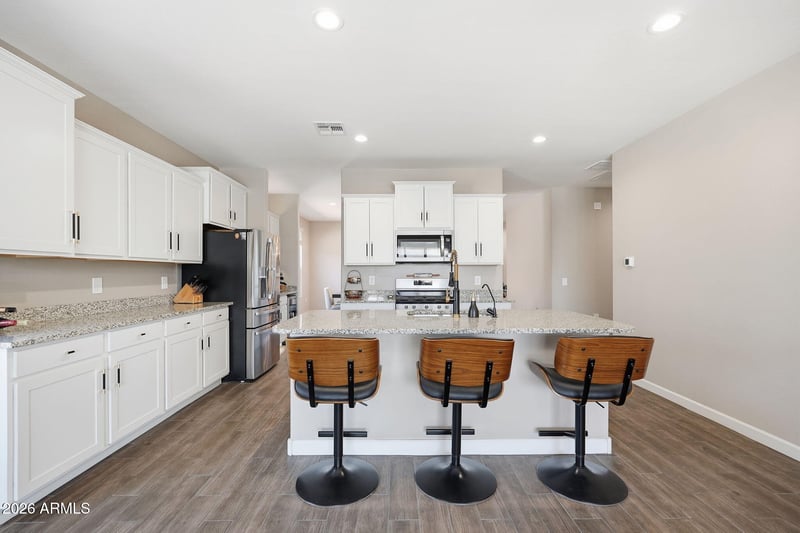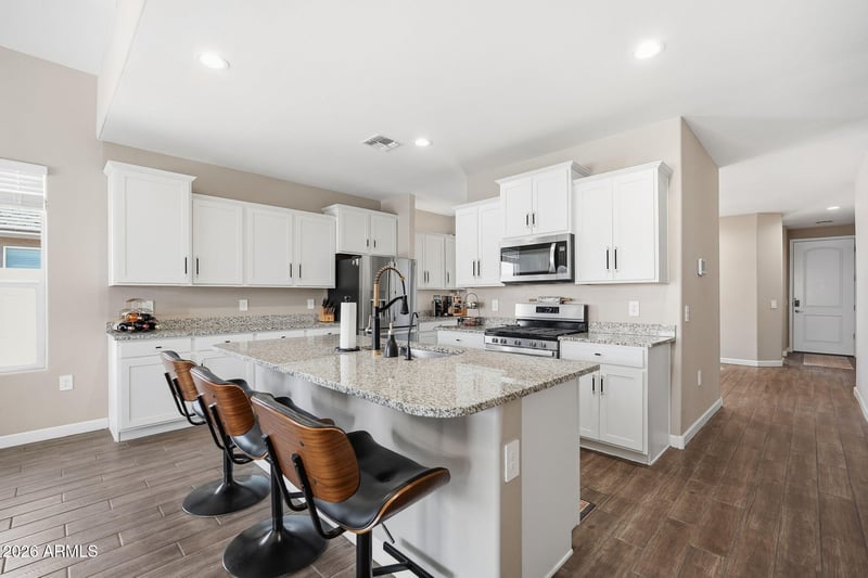 Listing details for 37777 Santa Barbara Ave, Maricopa, AZ 85138 : Set in Rancho Mirage, this thoughtfully upgraded home is located on a desirable north south facing lot. Only a few years old, it offers a lengthy list of improvements already completed, saving time, expense, and effort. A fully integrated smart home system controls lighting and more, with smart switches installed throughout. Ceiling fans in every room help maintain comfort year round. The garage features epoxy flooring for durability and easy maintenance. Water quality and efficiency are addressed with a whole home water softener and reverse osmosis system already in place. Inside, 11 foot ceilings and wood plank tile flooring create an open, airy feel that carries throughout the home. Outside, the work is already done. Landscaping is complete, along with a pool, shade structure, paver front entry, and a storage shed. French drains have been installed for proper water management. A security screen door and eight exterior cameras provide an added layer of peace of mind. The location adds to the appeal, with multiple parks and playgrounds nearby, easy access to the University of Arizona Maricopa campus, and close proximity to schools, shopping, and dining. This home is ready for you to simply move in and enjoy