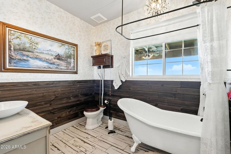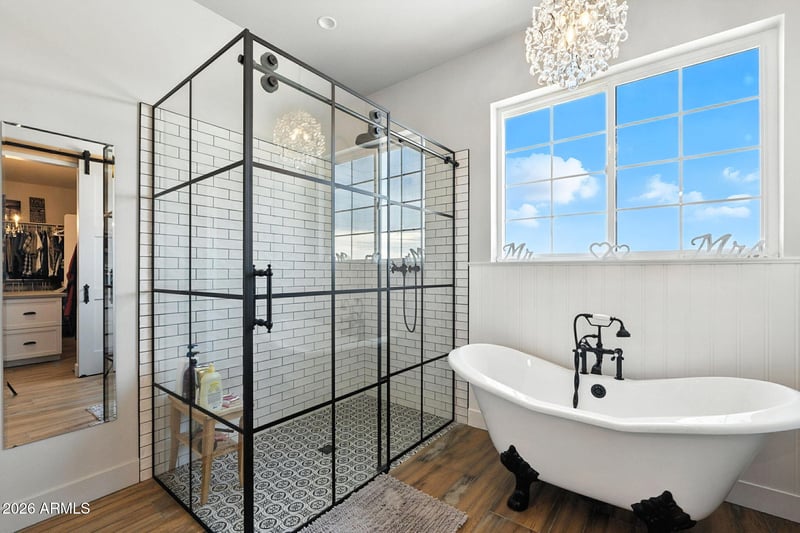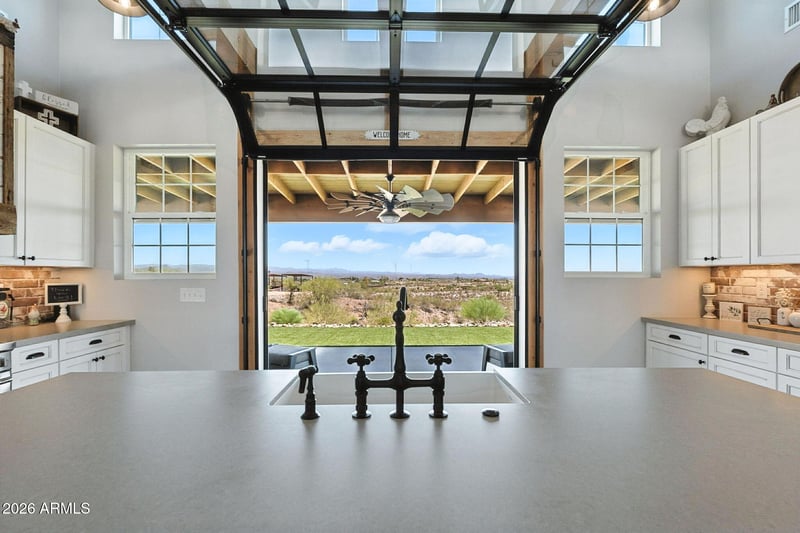 Listing details for 37827 Gods Country Rd, Wickenburg, AZ 85390 : Gorgeous Custom Home, with the best views in Wickenburg on over 6 acres! Refined modern Barndominium farmhouse architecture at its finest! Charming ranch-inspired design throughout with over 2800 sqft of living space! The main home offers 3 bedrooms and 2 bathrooms, totaling 2080 sqft. This property also includes a 737 SqFt Guest House with an additional 1 bed/1 bath--and a detached 1387 SqFt RV garage. Showcasing an expansive full-length covered front porch...and a full-length covered back patio. Dual wooden faux carriage-style doors flank a central glass-paneled entry, creating strong curb appeal and balanced design. Clean gravel landscaping and a straight paver walkway enhance the crisp, ranch-inspired aesthetic. Inside, the home offers an open-concept great room with soaring vaulted ceilings and exposed wood beams...Clerestory windows flood the space with natural light, while wide-plank wood-look flooring adds warmth. The kitchen is anchored by a large island with farmhouse sink, stainless steel appliances, white shaker cabinetry, quartz countertops, and a brick backsplash. Statement ceiling fans and modern-rustic lighting reinforce the farmhouse character.