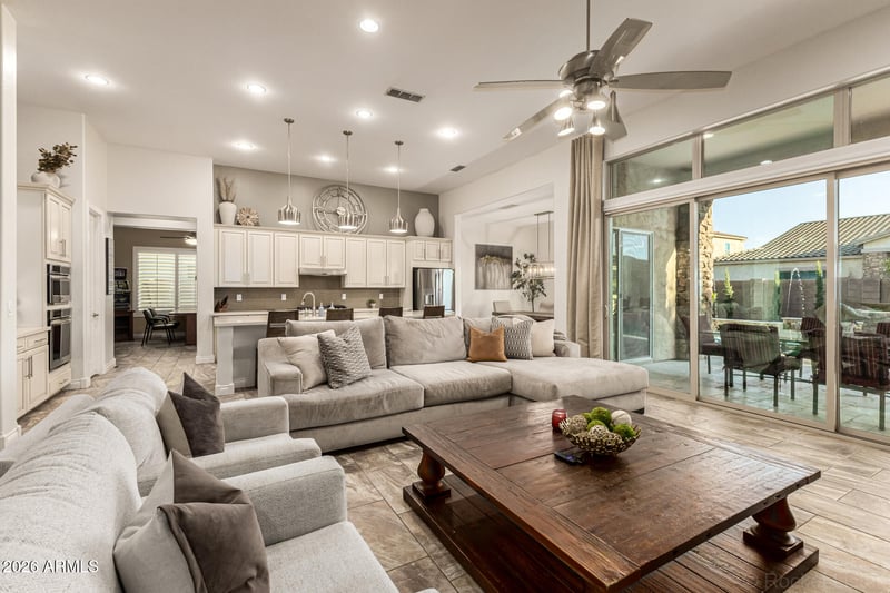 The chef's kitchen is the heart of the home, featuring gas cooking, stainless steel appliances, abundant staggered cabinetry, and a massive oversized island, all opening seamlessly to the spacious great room--perfect for entertaining and everyday living. 8-foot panoramic sliding doors extend the living space outdoors, creating a true indoor-outdoor Arizona lifestyle.