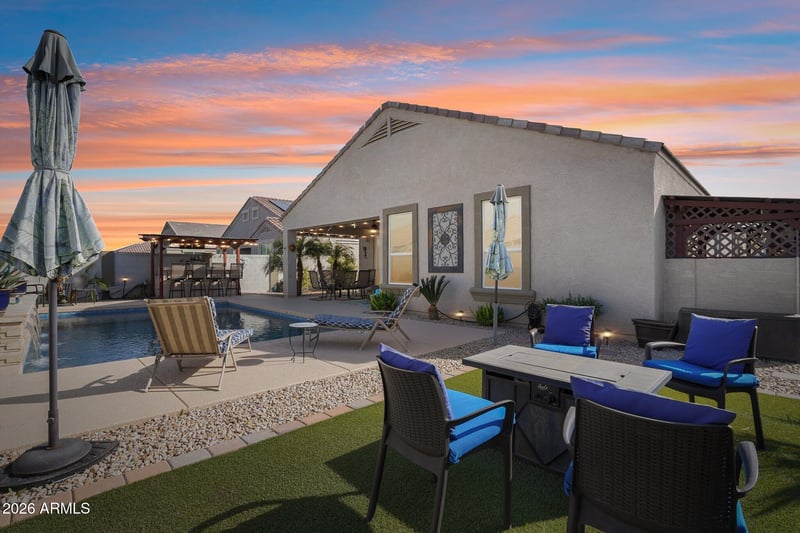 The primary bedroom offers a private retreat with dual sinks, a walk-in shower, and generous closet space. The additional bedrooms provide flexibility for guests, home offices, or extra living space. Out back, enjoy your own private escape with a sparkling pool, covered patio, outdoor bar and pergola, outdoor shower, and low-maintenance landscaping with artificial turf. Extra garage storage is an added bonus.
