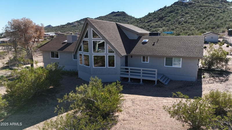 Listing details for 38201 33rd Ave, Phoenix, AZ 85086 : AMAZING MOUNTAIN VIEWS! Enjoy stunning vistas from this ELEVATED 2.5-ACRE LOT featuring a beautifully updated 3,024 sq ft home with main house (~2,200 sf) and attached guest apartment (~840 sf)—perfect for multi-generational living or rental income. The main home offers a spacious primary suite, loft bedroom with view deck, updated baths, and an open living/dining area with tongue & groove cedar ceilings, view windows, and wood-burning fireplace. The remodeled kitchen features quartz counters, upgraded cabinets, large island, stainless appliances, and recessed lighting. The attached guest home includes a full kitchen, large living room, bedroom with walk-in closet, and remodeled bath. MAJOR UPDATES: new dual-pane windows t/o, new motorized shades and wood shutters, MORE... luxury vinyl flooring, remodeled kitchens & baths (2023), remodeled guest suite, HVAC systems and roof replaced (2018). 2x6 construction, detached 1-car garage + RV parking, Shared well. Enjoy privacy, space, and income potential -- split the lot or simply relax and take in the panoramic city & mountain views. Minutes to I-17 fwy, Lake Pleasant, TSMC, Anthem.