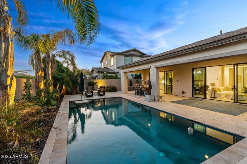 Listing details for 3827 Mead Dr, Chandler, AZ 85249 : Welcome to Avian Meadows by Toll Brothers, one of the Southeast Valley's most desirable neighborhoods. This beautifully designed single-level home features 4 bedrooms plus a den and a teen/media room with 3.5 baths in a spacious, split floor plan. The gourmet kitchen showcases quartz countertops, stunning cabinetry, a 36'' gas cooktop, 48'' built-in refrigerator, wall oven, and a large walk-in pantry. The primary suite offers a spa-like retreat with dual vanities, a soaking tub, and an oversized walk-in shower. Expansive living and entertaining spaces include the kitchen and great room with 24 feet of sliding glass doors, seamlessly connecting to the backyard for true indoor/outdoor living. Step outside to a resort-style backyard with travertine decking, a sparkling heated pool