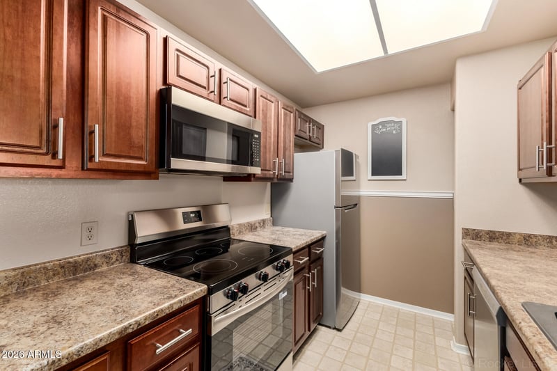 Listing details for 3830 Lakewood Pw #2031, Phoenix, AZ 85048 : Desert living at it's finest! Near 40th St & Chandler Blvd shops/dining (walking distance to Trader Joe's/Safeway/Starbucks) * BRAND NEW stainless steel appliances! Portofino Condominiums in Ahwatukee Foothills. Second-story 1 bed/1 bath residence (693 SF) with an open living/dining layout, breakfast bar kitchen, and living room fireplace. Brand-new stainless steel appliance package. Private north-facing balcony/patio with exterior storage closet. Bedroom with WALK-IN CLOSET; full bath. In-unit laundry with full-size washer/dryer included. Assigned covered parking (carport). Community features include biking/walking paths, clubhouse/rec room, media room, workout facility/fitness center, and community pool with heated pool and heated spa options. Easy access to I-10 and Loop 202.