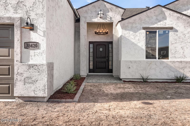 Listing details for 38420 Buckeye Rd, Tonopah, AZ 85354 : TIRED OF THE CITY NOISE? Move into this beautiful new build and enjoy the peace and quiet Tonopah has to offer. Property sits on an acre of land protected by a barbed wire perimeter fence at the end of a cul-de-sac with its own private water well. Inside property features 9' ceilings all through out, 4 bedrooms and 2 and a half baths. This open concept living room and kitchen area makes it ideal for entertaining guest and enjoying family time. Master bedroom features his and hers walk in closets, dual sinks, private toilet room and a beautiful soaking tub with a large picture window to relax and unwind. Two of the other bedrooms share a Jack and Jill bathroom, each with their own private sink. Home features a 3 car oversized garage and paved patios.