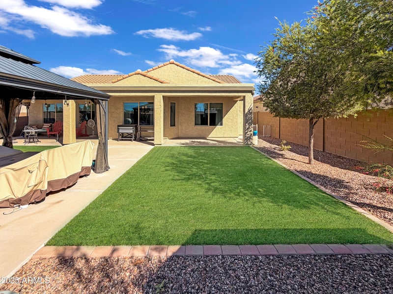 Listing details for 3848 Huntington Dr, Florence, AZ 85132 : **Immaculate Home with an Amazing Backyard** This home has a very custom feel and is beautiful inside and out. Open floor plan with a gourmet kitchen and a separate den with French Doors. Upgraded fixtures, custom lighting, suround sound, large kitchen island w/ pendant lighting, eclectric fireplace, custom window treatments and more. The backyard is a private Oasis with no neighbors and 2 houses from a really nice park...perfect for the kids. Lots of really nice upgrades like soft start AC control, NEW exterior paint, garage shelving, soft water, filtered water, tile backsplash, tankless hot water heater...just to name a few. Resort style living in Anthem at Merrill Ranch! BONUS: First buyer to negotiate accepted offer will have choice of any and all furnishings at no charge.