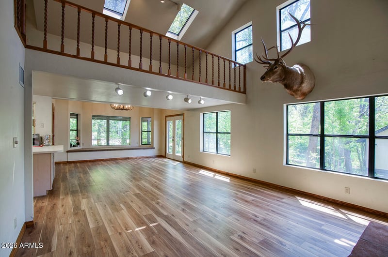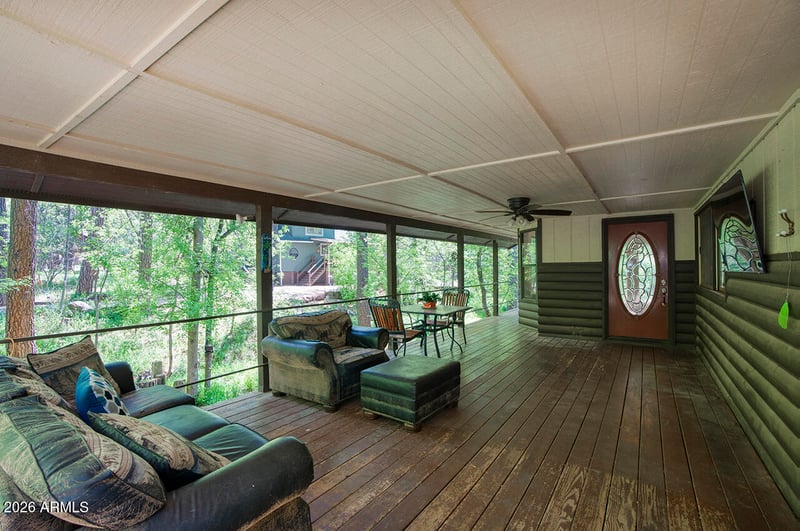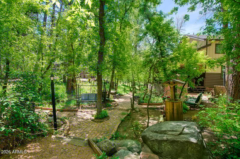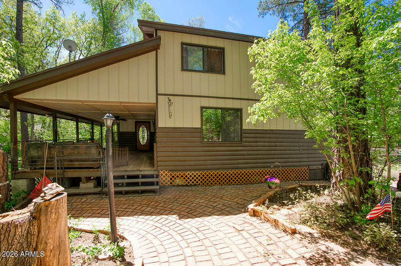 Listing details for 387 Columbine Rd, Payson, AZ 85541 : Two-story log-sided cabin in Christopher Creek just outside Payson, Arizona. 2 bedrooms, 2 bathrooms, loft, office, 1,869 sq ft on a wooded lot with no HOA. Most people don't believe a place like this exists in Arizona. Towering pines, mature oaks, AZ Black Maple trees, crabapple trees, grape vines, lavenders, ferns, wildflowers, and a seasonal creek bed, all on one property. An entire ecosystem you never knew Arizona had. As soon as you pull up, winding brick pathways guide you through the yard past a decorative wooden footbridge, a porch swing under the trees, a fire pit patio, and a picnic area all shaded by a canopy so dense every season brings a completely different feel to this property. A ''Welcome'' sign greets you at the covered front porch and deck where you can sit with your morning coffee and watch the elk, deer, squirrels, blue jays, turkeys, and other wildlife. Step inside and see the brand-new 22m Luxury Plank vinyl flooring runs throughout the main level. The living room is the heart of this home, vaulted ceilings, skylights pouring in natural light, and a wood-burning fireplace installed in 2024 that will keep you warm on those cold mountain nights. The kitchen connects right to the living and dining area with newly updated appliances that include an electric stove, built-in microwave, dishwasher, disposal, refrigerator, walk-in pantry, and additional storage under the stairs. Everything you need and nothing you don't. Head upstairs to the master suite with a full bathroom and step out onto the balcony for tree-top views you won't find anywhere else. Yes, this home has 2 separate decks! The loft overlooks the living room below and works perfectly as a reading nook, guest space, or second office. The separate den/office is also upstairs, giving you a quiet, dedicated workspace away from the main living areas. Tons of storage throughout the home, you won't be left looking for space. Back on the main level, the second bedroom has easy access to the second full bathroom. Now let's talk about the outside, because this property is something special. Brick pathways connect the covered patio, multiple seating areas, a storage shed, a bridge, and a workshop. The detached carport keeps your vehicle covered, there's RV hookup & RV parking for your toys, and enough space to park 8 vehicles. Chain link fencing secures a majority of the perimeter. No HOA fees. Christopher Creek sits just off Highway 260 in Gila County, less than 25 minutes from downtown Payson where you'll find shopping, dining, and everything you need. Whether you're looking for a mountain second home, a vacation rental property, or a permanent residence, this home in the pines is the one you've been searching for!