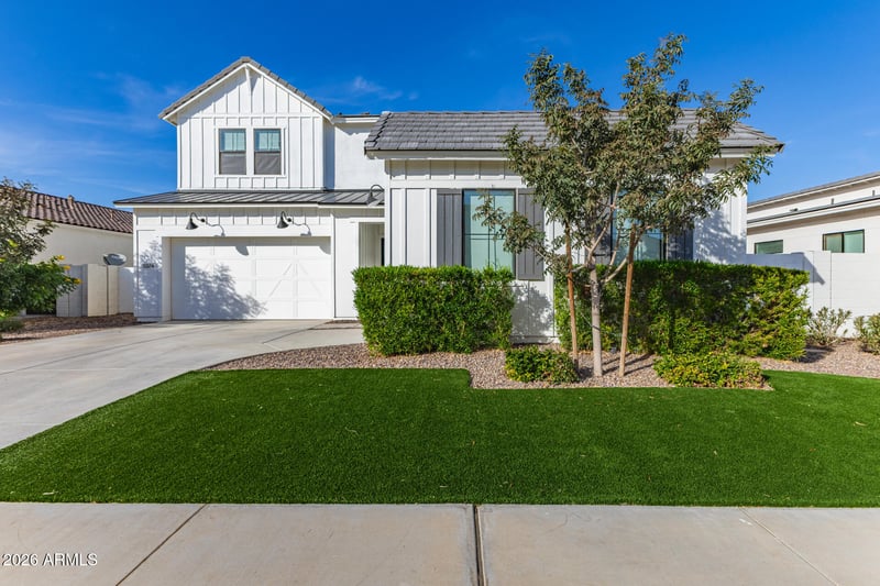 Listing details for 3874 Serpentine Dr, San Tan Valley, AZ 85144 : You don't want to miss this stunning 2-story gem with a 3-car garage with EV charger! The 3rd car which is separate is set up as a gym also has AC! Inside, gorgeous wood-look floors flow through a spacious great room designed for both everyday living and entertaining. The sleek kitchen is a showstopper, featuring stainless steel appliances with double wall ovens, quartz countertops, abundant white cabinetry, a center island with breakfast bar, and a walk-in pantry. The downstairs primary retreat offers a private bath with dual sinks and a generous walk-in closet. Also downstairs is a bedroom and full bathroom great for guests. Upstairs the versatile loft is ideal for a media center, while an additional cozy nook works perfectly as a home office or creative studio with built in desk Six rooms all together and 4.5 baths one being a half bath for visitors so 4 full bathrooms. Out back, unwind under the covered patio, enjoy the low-maintenance artificial turf, timeless travertine, and cool off in the fenced-in amazing pool and no worries if you don't need or want the fence it is removable also. The beautiful custom pergola has electric and a TV great for entertaining! This luxurious home truly has it all. Located in the highly sought after Toll Brothers community called The Preserves at San Tan with so many wonderful and unique amenities! Come experience it for yourself.