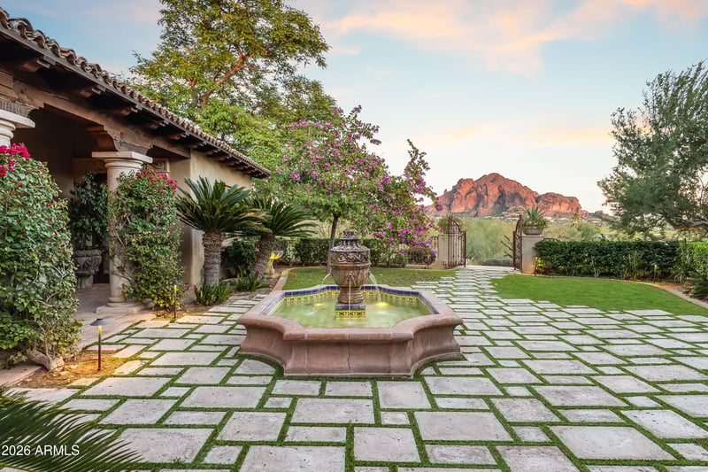 Listing details for 3900 Bethany Home Rd, Paradise Valley, AZ 85253 : Gated Paradise Valley estate crafted by Nance Construction, offering exceptional architectural integrity, elevated finishes, and sweeping 350-degree mountain views. Privately positioned behind gates and framed by mature desert landscaping, this remarkable residence makes an immediate impression with dramatic arched entryways, soaring ceilings, exposed wood beams, paneled brick ceiling details, and hand-finished plaster walls. French doors and expansive windows flood the home with natural light, while timeless chandeliers, designer sconces, and multiple concrete gas fireplaces create warmth and sophistication throughout. The open-concept floor plan seamlessly connects the formal living room with wet bar, formal dining, and chef's kitchen—designed for effortless entertaining. The kitchen features high-end appliances, an oversized island, and its own fireplace, blending function with ambiance. Each space offers seamless indoor-outdoor living with direct backyard access and stunning mountain views. The primary suite is a serene retreat, showcasing breathtaking vistas, a private patio, fireplace, and a spa-inspired bath complete with dual vanities, a soaking tub, separate shower, enclosed water closet, and custom walk-in closet. The resort-style backyard embodies elevated Arizona living with covered patios, multiple outdoor fireplaces and fountains, and a ramada with built-in BBQ ideal for entertaining. The custom pool and spa feature ornate cement water elements and an expanded deck, all set against panoramic mountain backdrops. Additional highlights include three guest ensuite bedrooms, a nearly 1,300 sq ft finished basement with wine storage, and a three-car garage. A rare opportunity to own a timeless Paradise Valley estate where craftsmanship, privacy, and breathtaking scenery define the lifestyle.