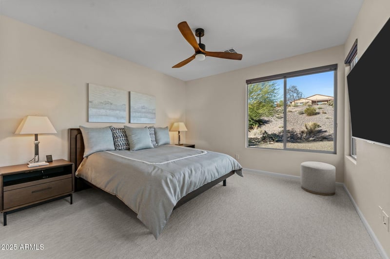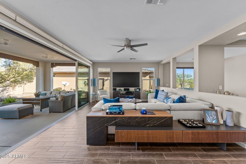 A stunning wall of retractable sliding glass doors allows for seamless indoor/outdoor living. Step outside to a large covered patio overlooking a gas firepit surrounded by low-maintenance turf, ideal for relaxing year-round. Additional highlights include an extended garage for extra storage or workspace and the peace of a location with no road noise. Come discover the perfect blend of comfort, style, and resort-style living that makes Wickenburg Ranch one of Arizona's premier destinations.