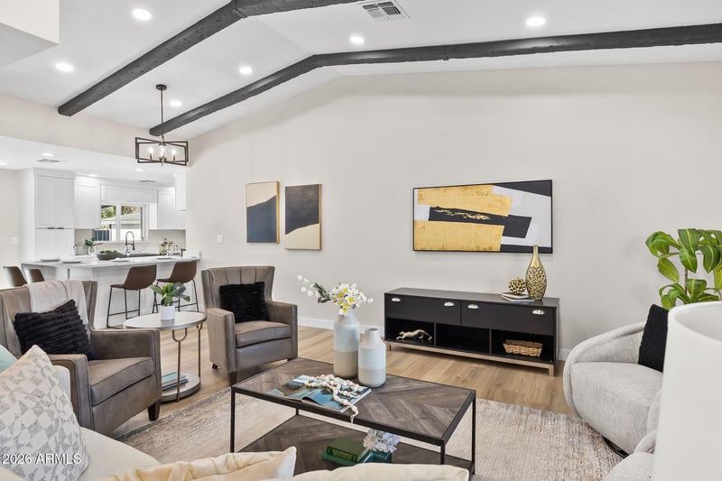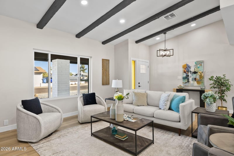 Listing details for 3901 Angela Dr, Glendale, AZ 85308 : OWNED SOLAR! Fully RENOVATED 3-bedroom, 2-bath home features a 2-car garage and a comfortable, functional layout ideal for everyday living. Inside, the home offers a bright great room with vaulted ceilings, recessed lighting and attractive laminate wood-look flooring throughout the entire home. Updated windows and a new sliding glass door allow for plenty of natural light and an inviting interior feel.