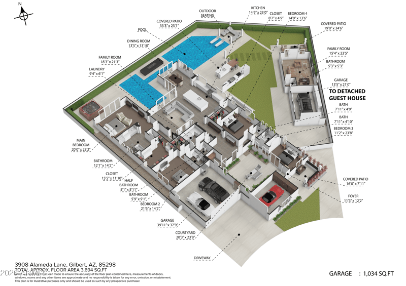 3908 Alameda Ln, Gilbert, AZ 85298 and is listed for sale at $2,150,000.00. This home was built in 2019, contains 3694 square feet of living space, and sits on a 0.32 acre lot. This residential home is priced at $582.02 per square foot.