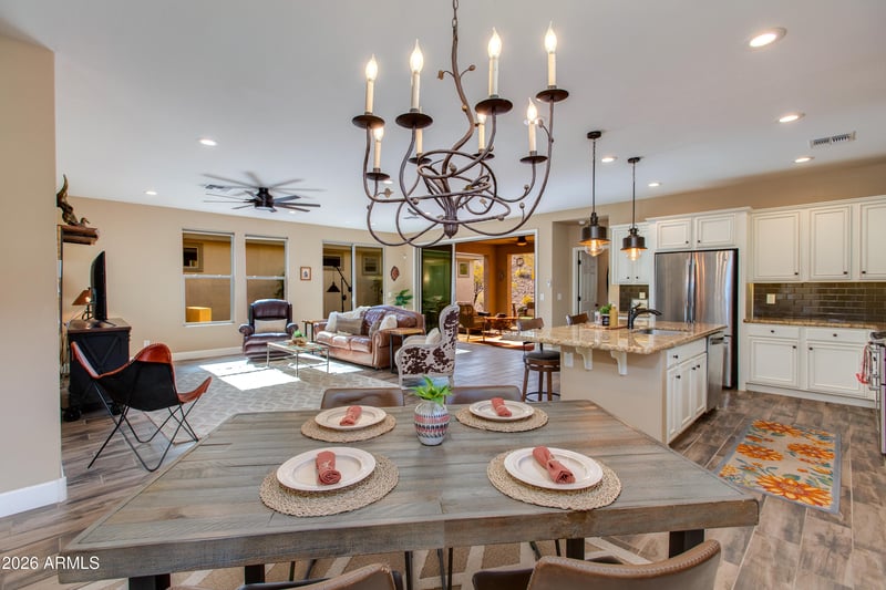 Listing details for 3914 Goldmine Canyon Way, Wickenburg, AZ 85390 : TURN-KEY, lock-&-leave Stetson floor plan by Shea Homes—ideal for full-time resort living or an effortless part-time getaway. Travel with peace of mind knowing HOA-maintained landscaping keeps everything looking pristine. Warm, inviting tones throughout complement tile flooring in main living areas, upgraded granite countertops & designer tile accents in kitchen & primary bath. Open 1,550sq ft floor plan lives large with seamless indoor-outdoor flow to a private outdoor living space. Home conveys fully furnished—everything you need to open the door & begin your resort lifestyle immediately. Just moments to Charlie's Park & walking trails. 2 bed, 2 bath, thoughtfully designed for easy living.
