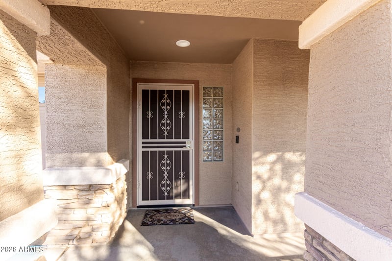 Bedrooms are generously sized, including a spacious primary suite with double-door entry. The primary bath offers a separate tub and shower, dual vanities, a private toilet room, and direct access to the covered patio, perfect for enjoying Arizona mornings or relaxing evenings outdoors.