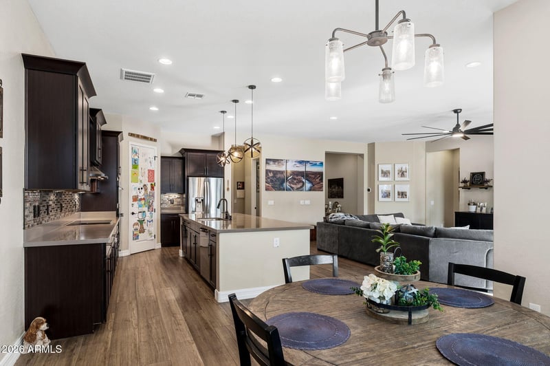 Listing details for 3921 Chestnut Ln, Gilbert, AZ 85298 : This impeccably maintained, move-in-ready Meritage residence welcomes you through a grand foyer that opens seamlessly into expansive living and dining spaces designed for both everyday elegance and elevated entertaining. At the heart of the home, the chef's kitchen impresses with 42'' staggered, java-stained cherry wood shaker cabinetry, premium stainless-steel KitchenAid appliances, and an effortless flow into the main living areas. Step outside to your private oasis: a thoughtfully designed pool with cascading waterfall and color-changing SMART lighting, all controlled from an app. The space is further enhanced by a UV pool filtration system, travertine patio, turf accents, and a striking outdoor fireplace—creating a true year-round resort experience. A removable pool fence offers peace of mind without compromising aesthetics.