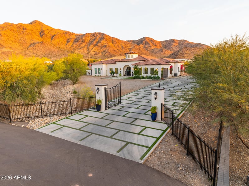 A private gated paver-lined driveway sets the tone for this exceptional property, offering both security and curb appeal. Step through the custom iron front door into a grand circular rotunda featuring a skylight and crystal chandelier, creating an unforgettable first impression. Architectural details shine throughout, with elegant archways, ornate stone columns, and expansive 15-foot sliding glass doors that immediately frame the stunning South Mountain views. Designed for both everyday living and elevated entertaining, the home features soaring 14-foot ceilings in the main living areas, transitioning to 12-foot ceilings in the bedrooms, along with elegant tile flooring and designer lighting throughout. The chef's kitchen is thoughtfully appointed with granite countertops, crisp white cabinetry, a walk-in pantry, a built-in oven and microwave, an electric cooktop with custom hood, and an oversized island accented by designer stained-glass pendant lighting. A formal dining room sits just off the kitchen, highlighted by a striking wrought iron and crystal chandelier.