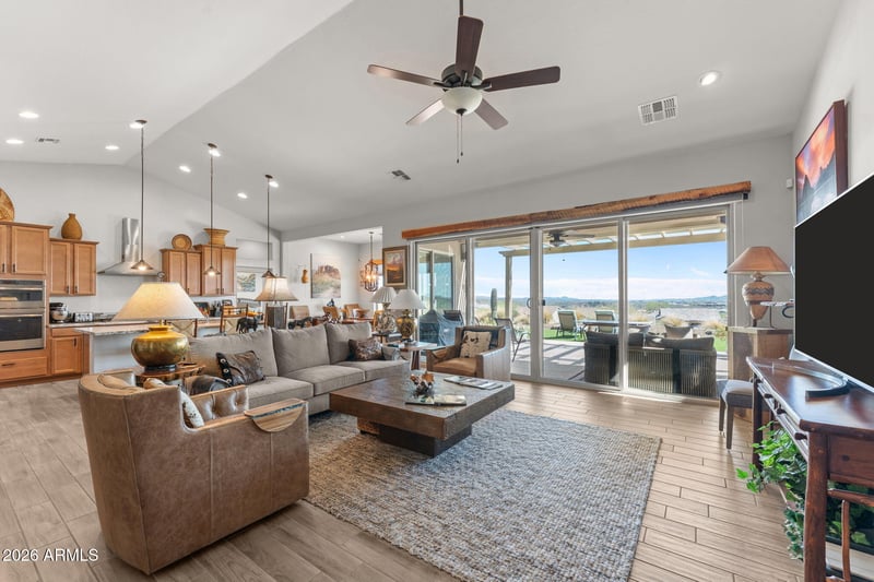 Listing details for 3984 Rolling Stock Way, Wickenburg, AZ 85390 : Set within the desirable Outlaw neighborhood of Wickenburg Ranch, this Wild Horses model captures the essence of relaxed desert living with a refined, modern edge. From the moment you arrive, the home's inviting presence and thoughtful design set the tone for what's inside. Step into an open-concept floor plan where natural light pours in through expansive windows and large sliding glass doors, creating a seamless connection between indoor and outdoor living. The great room flows effortlessly into a well-appointed kitchen, offering generous counter space, quality finishes, and a layout ideal for both everyday living and entertaining. The primary suite provides a quiet retreat, complete with a spacious layout and a well-designed en-suite bath. Additional bedrooms, separated by a barn door, offer flexibility for guests, hobbies, or an additional home office. Out back is where this home truly shines. The extended patio and pergola frame sweeping views that capture Arizona's breathtaking sunrises, while the stone gas fireplace creates a warm, inviting space to gather year-round. Whether you're enjoying a quiet morning or hosting friends in the evening, this outdoor setting delivers an exceptional lifestyle experience. Blending comfort, style, and functionality, this Wild Horses model offers a rare opportunity to enjoy elevated living in one of Wickenburg Ranch's most sought-after neighborhoods.