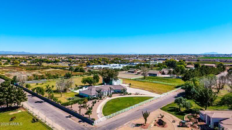 Listing details for 39899 Creekside Rd, San Tan Valley, AZ 85140 : Prepare to be amazed! Check out this luxurious 5 bed, 4 bath residence now for sale in San Tan Valley! Nestled on a HUGE 3.5 acre corner lot & featuring a stunning facade, a manicured landscape w/lush natural turf, and a 3 car garage plus a detached RV garage & workshop. Come inside to discover a welcoming foyer which flows seamlessly into formal dining & living areas showcasing soaring ceilings w/crown molding, stylish columns, elegant wood-look flooring, soft carpet in all the right places, dazzling light fixtures, and plantation shutters. The gourmet kitchen is truly worthy of a chef, comprised of staggered cabinetry w/granite counters, tile backsplash, SS appliances, a prep island, and a peninsula complete w/a breakfast bar. New roof 2yrs ago, HVAC 5yrs ago