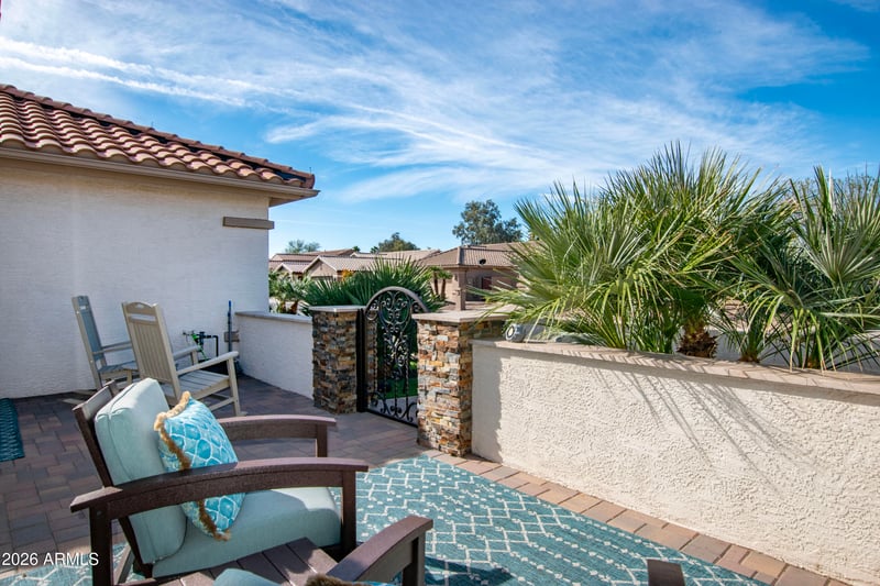 Listing details for 3997 160th Ave, Goodyear, AZ 85395 : This beautifully updated 2-bedroom, 2-bath home with a versatile den offers comfort, style, and exceptional upgrades throughout. The den features barn doors and a closet, making it ideal as an office or easily convertible third bedroom. Tile flooring runs through the main living areas with plush carpet in the bedrooms, complemented by newer oversized baseboards. The kitchen features quartz countertops, stainless steel appliances, an undermount sink, backsplash, breakfast bar, and a GE Café stove (2025). Additional upgrades include a refrigerator (2023), whole-house water filtration system, RO system for the sink and refrigerator, and owned solar installed in 2023. Major systems were updated in 2021, including the furnace, air handler, and hot water heater. The home also features an... epoxy-coated garage floor (2022), updated toilets, a living room ceiling fan (2025), and a striking main bedroom feature wall. Outdoor living shines with beautifully landscaped front and back yards, paver patios, faux grass, lighting, fire pit area, new irrigation and dripper systems, and automatic privacy screens on the covered back patioperfect for enjoying the PebbleCreek lifestyle.