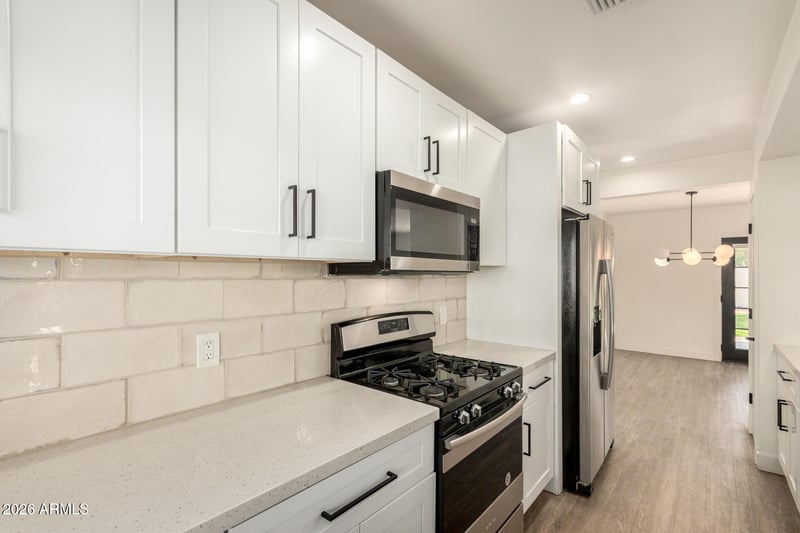Listing details for 4001 8th Ave, Phoenix, AZ 85013 : Perfectly situated between the I-17-AZ 51 & the 202. This gorgeous 3-bed, 2 bath home with no HOA sits just 10 minutes north of downtown Phoenix. The interior blends modern charm and comfort seamlessly, showcasing wood-look floorings, contemporary lighting, ceiling fans throughout, and a stylish neutral palette. The impeccable culinary space features sleek shaker cabinets, tile backsplash, stainless steel appliances, granite countertops, and a breakfast bar with a pass-through window. The tranquil main retreat offers a closet and an ensuite. Gather with your loved ones and relax in the backyard, including a cozy covered patio ideal for morning coffee and a serene landscape with a grass area. What's not to love? Make it yours!