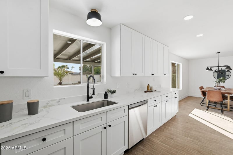 Listing details for 403 Gail Dr, Chandler, AZ 85225 : Make a splash with your own diving pool--featuring new PebbleTec and an updated pool deck, ready for summer fun! This beautifully updated 3 bed, 2 bath Chandler home also offers a NEW ROOF and fresh interior & exterior paint for a clean, modern feel. Durable block construction with north/south exposure helps keep the home energy efficient year-round. Wood-look tile flows through the main living areas, while the stylish kitchen showcases shaker cabinetry, quartz countertops, tiled backsplash, and stainless steel appliances. Bedrooms feature plush new carpet, and the primary suite includes a refreshed bath with quartz vanity.