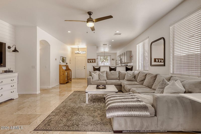Listing details for 4036 Angela Dr, Phoenix, AZ 85032 : Charming from the moment you arrive, this single-story 4-bedroom, 2-bath Phoenix home offers inviting curb appeal with a lush grassy front yard, mature shade tree, and classic brick accents at the garage. The welcoming exterior sets the tone for the warm, well maintained interior. Inside, high ceilings, new wood- replicated flooring, arched entryways, and recessed lighting create an open, airy feel. The kitchen is both stylish and functional, featuring slab granite countertops, stainless steel appliances, pantry storage, bar seating, and a bright eat-in dining space. Thoughtful updates include a water heater replaced in 2022, and an HVAC motor replaced in 2023. The laundry area has also been enhanced with added cabinetry for extra storage. The primary suite offers a spacious walk-in closet and a private bath, while decorative wall paneling throughout the home adds character and charm. Out back, the inviting yard features a covered patio and low-maintenance turf installed in 2023, perfect for relaxing or entertaining. This delightful home blends charm, comfort, and practical updates in one appealing package.
