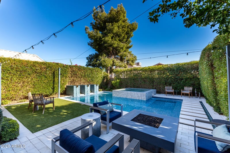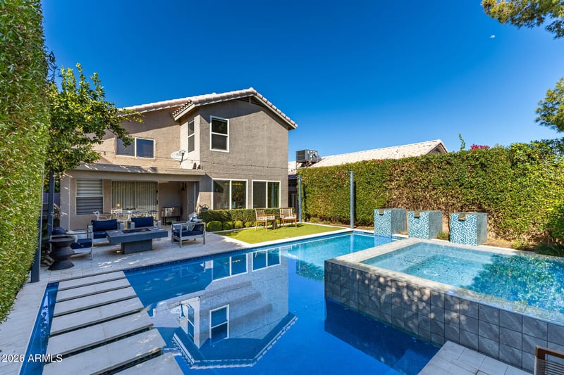 Listing details for 4043 Meadow Dr, Phoenix, AZ 85032 : Fully upgraded and thoughtfully designed, this 2-story, 1,816 sq ft home offers 3 bedrooms and 2.5 baths with elevated finishes throughout. Owned by an award-winning interior designer, the home showcases curated details and high-end upgrades at every turn. The kitchen was completely remodeled in 2022, featuring modern finishes, updated cabinetry, and a clean, functional layout ideal for both daily living and entertaining. The primary bathroom was fully remodeled in December 2025, delivering a spa-like retreat with contemporary design. A new garage door was installed recently. Step outside to a true resort-style backyard oasis, professionally designed and built by Creative Environments in 2020 with a $107K investment. Enjoy a heated pool, zero-edge spa, and fully automated, app-controlled system. The space is enhanced with tranquil water features, a custom-built natural gas fire table, limestone pavers, green turf, and an outdoor shower. Mature perimeter landscaping provides exceptional privacy, creating a secluded and luxurious outdoor experience. This home blends thoughtful design, modern upgrades, and resort-style living in one exceptional property.