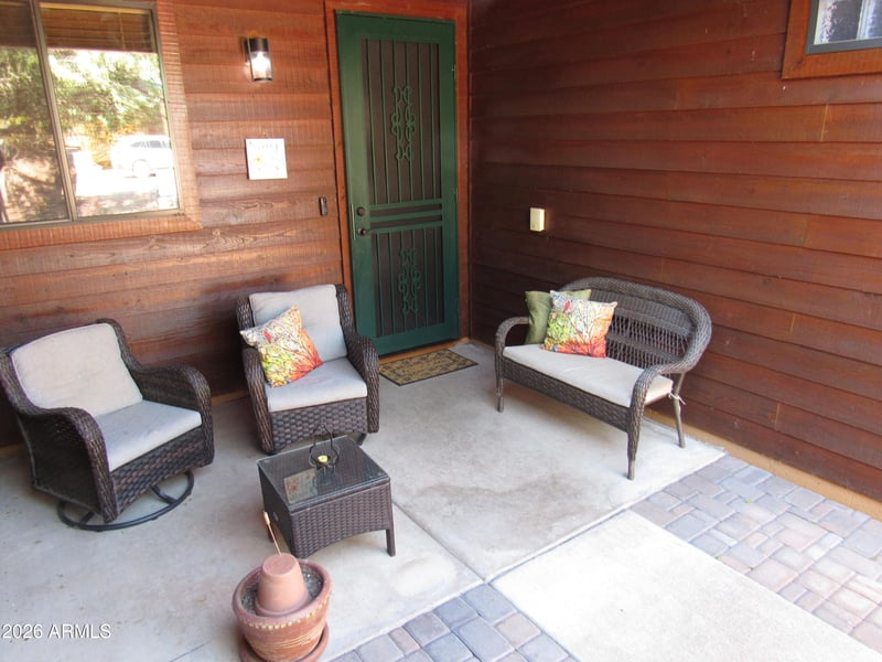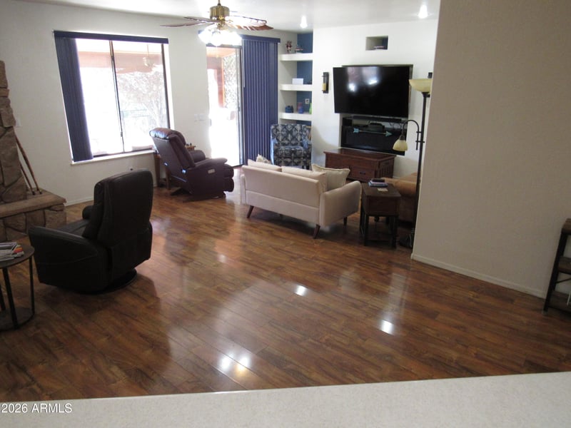 Stepping out of your car you'll notice this well-maintained home with easy car landscaping. Walking up to the home, you'll pass through a gate into a front patio area perfect for your early morning coffee or afternoon iced tea or cocktail. Ounce you walk through the front into the spacious foyer you notice the open floor place with laminate flooring and exquisite stone fireplace that invites you to come over and sit in the comfortable chairs for a minute or two soaking in the atmosphere of the great room. After relaxing in the recliners, you notice the alcove entertainment area to your right with big screen TV and sound system waiting for the evening movie with popcorn and beverages. Looking around you see the dining area and open kitchen with loads of cabinets and stainless-steel appliances, perched in the middle is a large island for meal prep for those family and friend gatherings. When you finish soaking it all in you remember, oh, there's the Main bedroom with ensuite, ounce you enter there's a stone accent wall and lots of space for a king-size bed. The ensuite features a walk-in shower, waist high counters with dual sinks, roomy walking closet, and that's not all! Off the main bedroom there is also a screened in AZ room to enjoy the great Rim Country weather with access to a covered patio, the back yard is adjacent to a green belt for more privacy. The secondary bedrooms are spacious; one is currently set up as office with vinyl planking for easy cleaning.