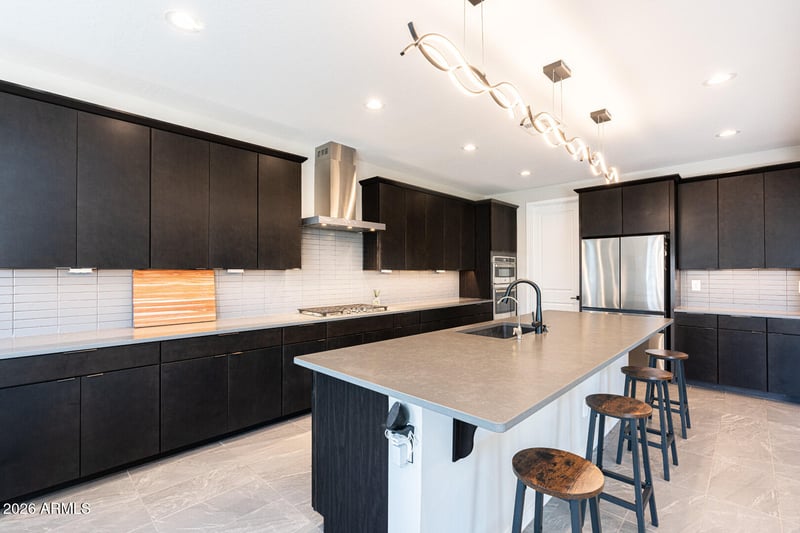 At the heart of the home is a show-stopping gourmet kitchen designed to impress and built for real life. Featuring a gas cooktop with designer hood, built-in oven and microwave, stainless steel appliances, and an expansive island with sink and breakfast bar, this space is perfect for entertaining or everyday living. Rich, dark cabinetry paired with a stylish backsplash adds depth and sophistication, whi the oversized walk-in pantry ensures everything has its place.
