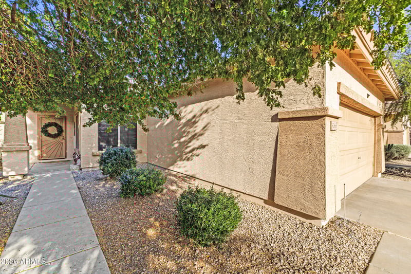 The spacious backyard is designed for Arizona living, featuring a large desert-landscaped outdoor space perfect for entertaining, relaxing, or enjoying low-maintenance beauty year-round. The garage adds practical functionality with built-in shelving ideal for storage, hobbies, or projects.