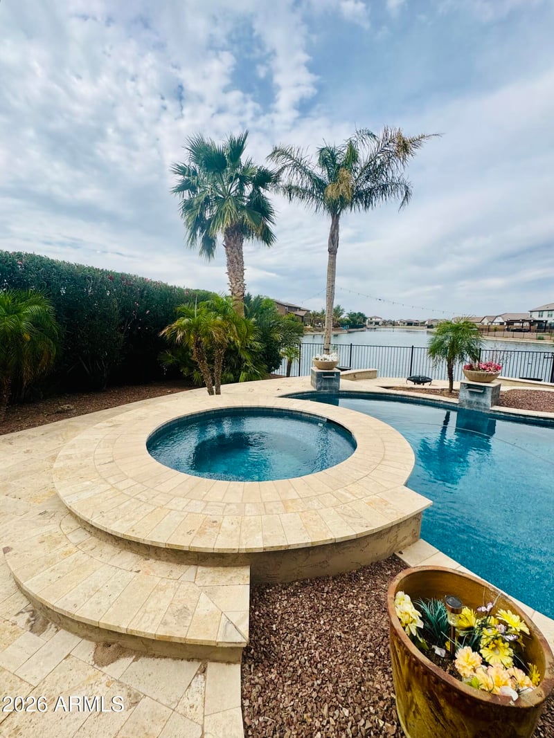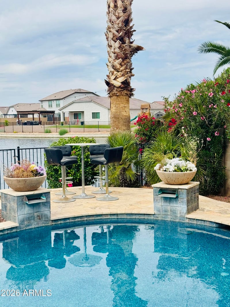 Listing details for 40636 Parkhill Dr, Maricopa, AZ 85138 : This exceptional lakefront property offers high-end luxury features throughout. The kitchen is equipped with a monogram gas range, built-in microwave, and granite countertops. There is both a formal dining room and an eat-in kitchen area. A bedroom and full bathroom are conveniently located downstairs, while numerous rooms benefit from water views. The spacious upstairs master suite includes a full master bathroom with a six-jet bath spa, waterfall shower, and a custom walk-in closet. All bedrooms are generously sized, and the upstairs loft provides an ideal family gathering space. The pebble Tec heated pool and spa, along with the fully paved yard featuring travertine pavers and multiple sitting areas-including a lower deck near the water-further enhance this lakefront home. Additional amenities include a three-car garage with custom cabinetry and impressive views throughout.