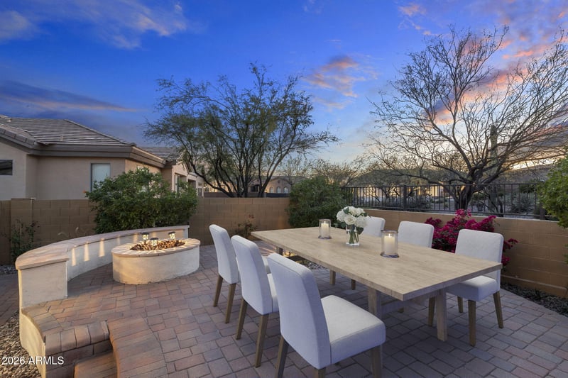 The resort-style backyard is ideal for relaxing and entertaining, featuring a heated pool and spa with a tranquil waterfall, an expansive 1,000+ sq ft paver patio, built-in BBQ, outdoor gas fire pit, and an adobe wood-burning fireplace, perfect for evenings under the Arizona sky.
