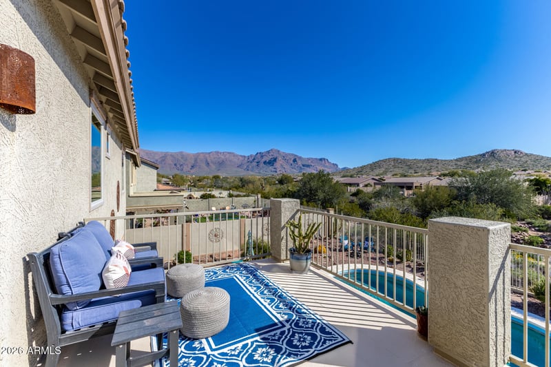 Listing details for 4107 Hackberry Trl, Gold Canyon, AZ 85118 : Experience elevated desert living with $1M unobstructed views of the Superstition Mountains & exceptional privacy. This beautifully upgraded home offers $175k in recent enhancements. A bright, open floor plan designed for comfort and effortless entertaining. Featuring 3 bedrooms, a den, a loft, and 3 full baths, the layout is highly versatile. The kitchen showcases granite countertops and rich hickory cabinetry, opening seamlessly to a warm family room, with formal living and dining spaces. A downstairs den with full bath is ideal for guests or a private office. Upstairs, enjoy a loft with tech center, two oversized bedrooms, and a luxurious primary retreat with dual vanities, jetted tub, separate shower, walk-in closet, and a RARE private 2nd Fl balcony. This is AZ Living at Its Finest!