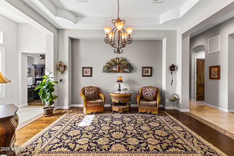 Listing details for 4123 Silver Ridge Cir, Mesa, AZ 85207 : Tucked away at the quiet terminus of a serene cul-de-sac, this exquisite estate serves as a private sanctuary, greeting you with the refined elegance of a custom paver driveway, classic stucco finish, and an atmosphere of total seclusion. The residence is masterfully designed for both intimacy and grand-scale entertaining, boasting a sophisticated split floor plan where each of the four spacious bedrooms enjoys the luxury of its own private en-suite bath. Inside, the home breathes with soaring ceilings and timeless architectural details, from the rich textures of eight-foot solid wood doors to the artistic precision of elegant, coffered ceilings in the formal dining room. Whether you are retreating to the dedicated executive office or indulging in the primary suitea resort-caliber sanctuary featuring engineered wood floors, a private sitting area, and a spa-inspired bath with dual walk-in closetsevery inch of the home exudes curated comfort. At its heart lies a gourmet chef's kitchen, anchored by a monolithic granite island and custom cabinetry, equipped with professional-grade tools including a six-burner gas cooktop, double ovens, and a walk-in pantry. This social hub, complete with a dedicated bar area and a charming beamed breakfast nook, flows effortlessly into a lush outdoor oasis via patio doors protected by heavy-duty screens. An integrated surround sound system carries the ambiance from the interior to the covered, color-stamped patio, where a heated pool with a waterfall feature and a relaxing hot tub set the stage for alfresco evenings. Guests can gather around the gas firepit or the fully equipped outdoor kitchenfeaturing a built-in grill, sink, and fridgewhile enjoying the mature landscaping and fresh citrus from your own lemon trees. Enhanced by modern luxuries like whole-home water filtration, hot water on demand, and a three-car finished garage with custom built-ins, this property offers a rare opportunity to inhabit a lifestyle of quiet opulence and effortless Arizona charm.